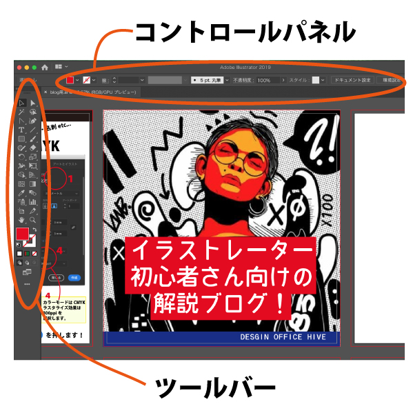 イラレは基本的に下記の画像の、コントロールバーとツールバーを